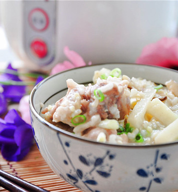 鲜竹笋60克,煮熟切片,用粳米50~100克,以水适量同煮成稀粥,加猪脂、食盐调味食。